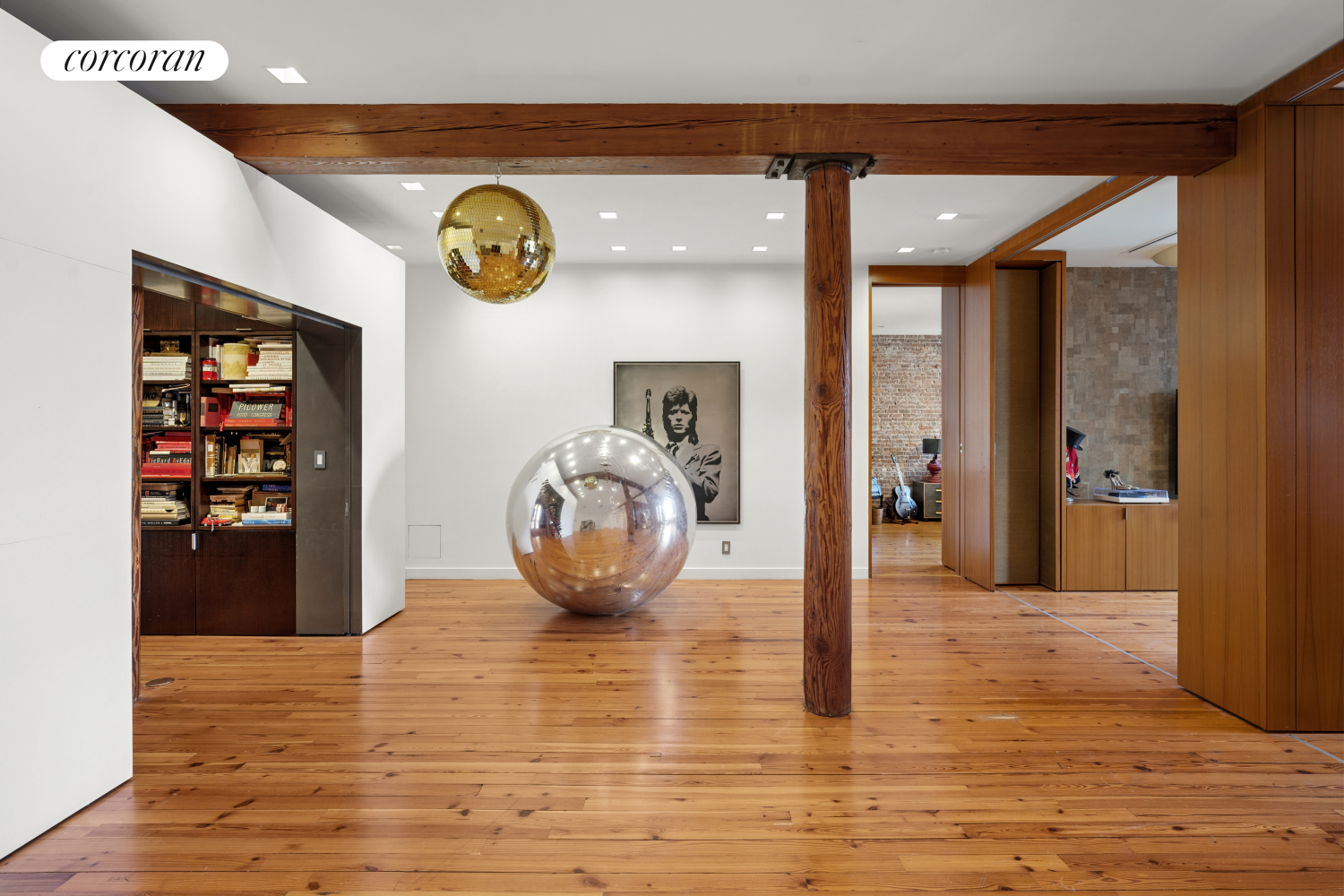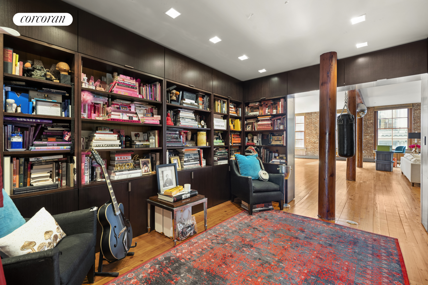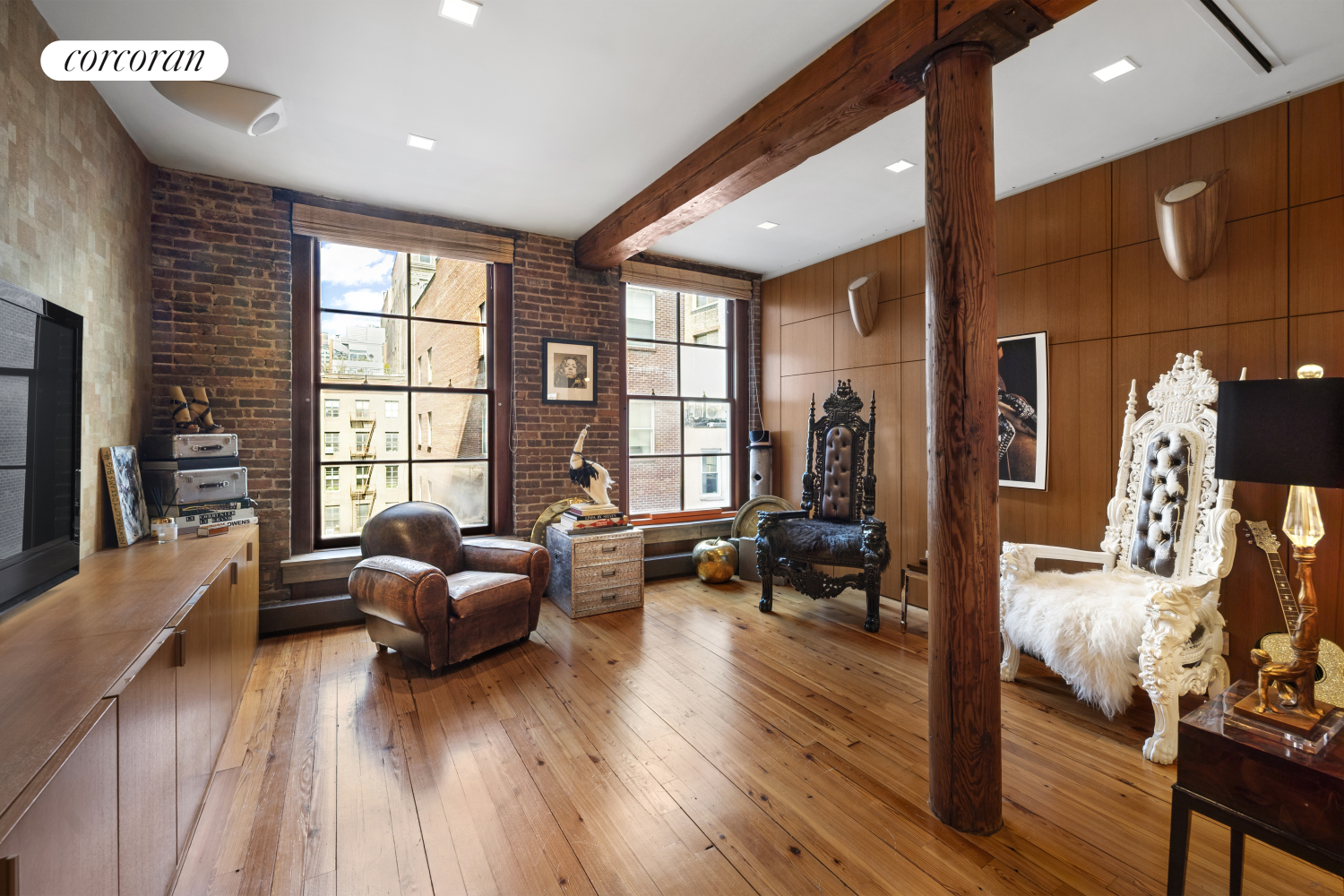 Arrive via your private elevator into an intimate foyer that leads to a grand living room, bathed in natural light from a striking wall of oversized industrial windows. Rich in character, the loft features exposed brick walls, original wooden columns, a gas fireplace, and soaring high ceilings-effortlessly merging raw authenticity with refined style.